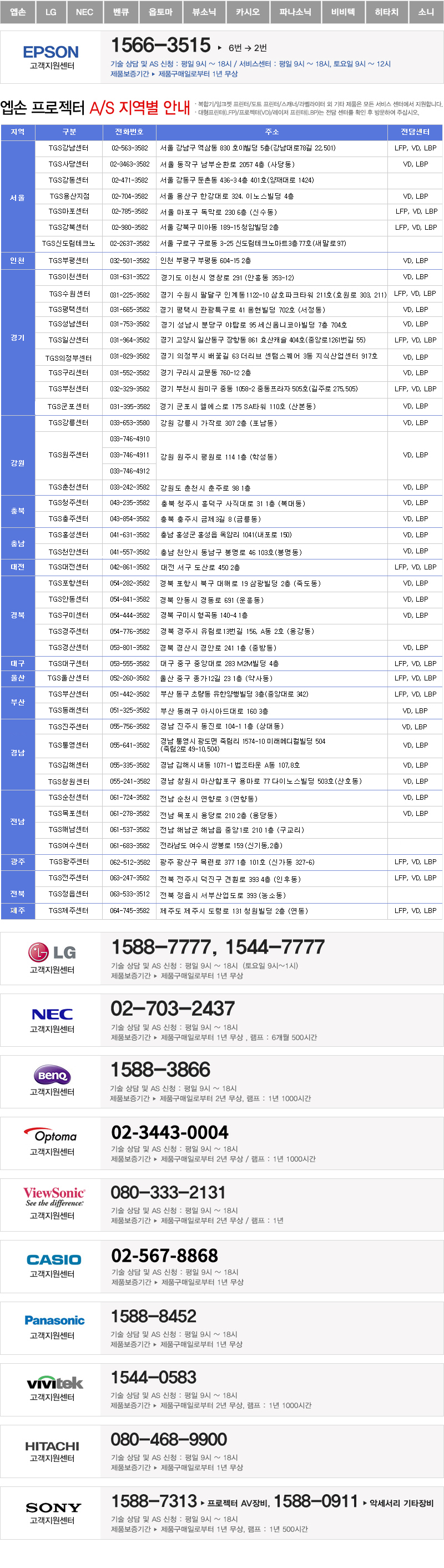 [A/S] 브랜드별 프로젝터 A/S 안내